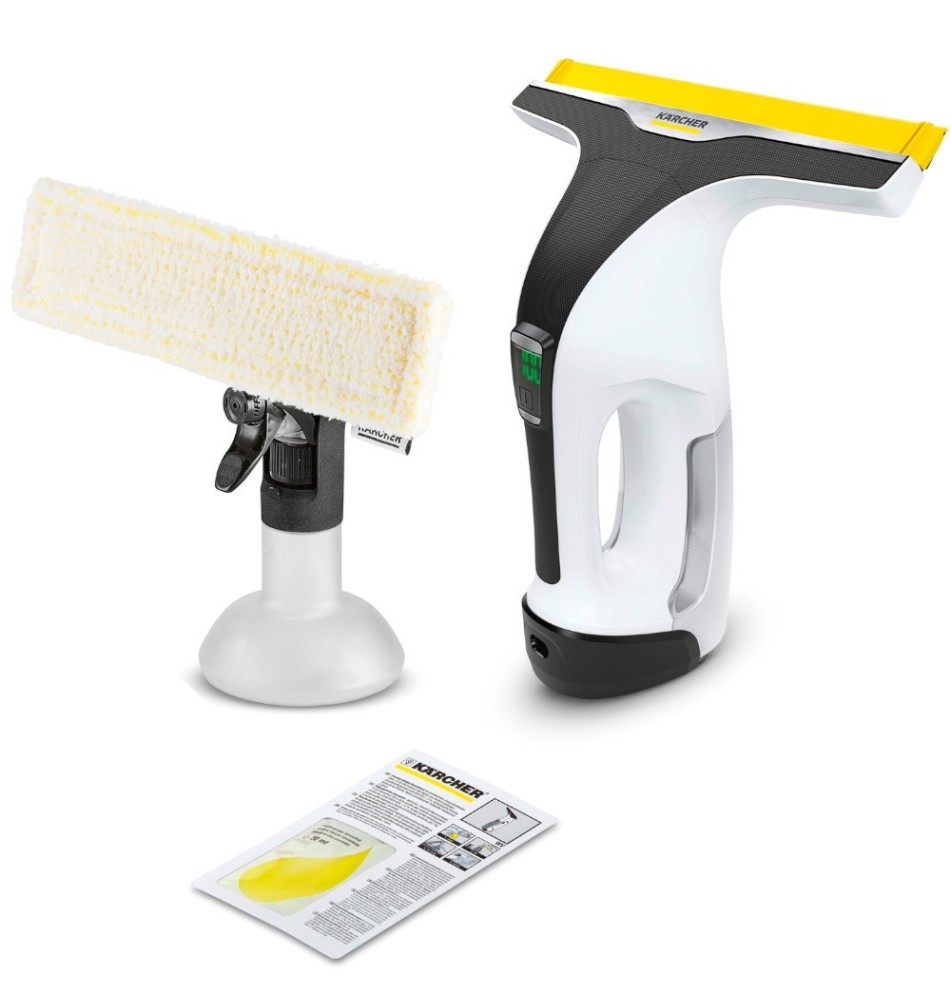 W wyposażeniu środek do czyszczenia okien (koncentrat – 1 x 20 ml), butelka ze spryskiwaczem, pad z mikrofibry, bateria litowo-jonowa oraz ładowarka.