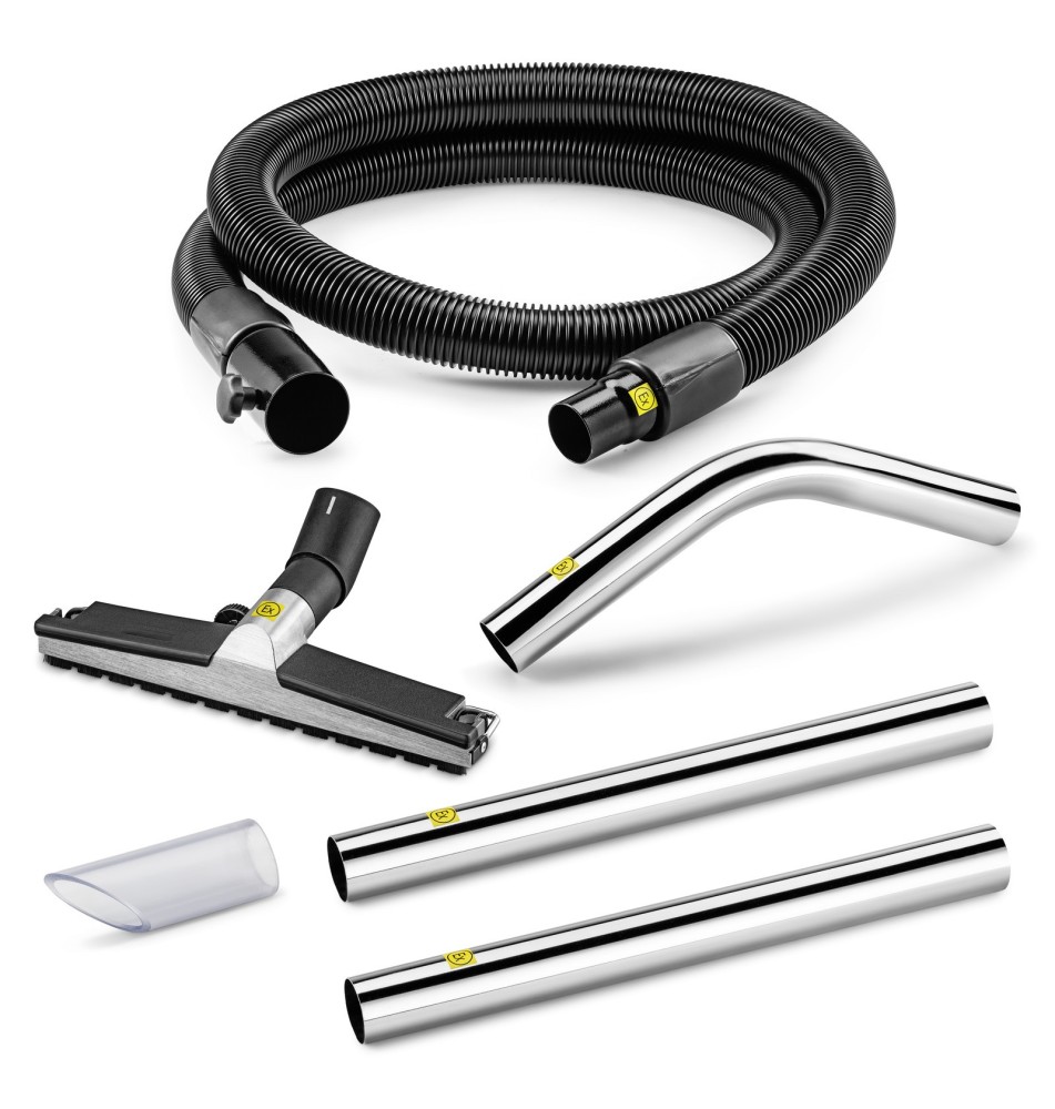 Zaawansowany zestaw do czyszczenia posadzek na sucho: Wąż EVA (9.989-924.0), uchwyt (9.990-930.0), 2× rura ssąca (9.990-934.0), ssawka podłogowa (9.990-936.0) i ssawka standardowa (9.989-761.0).
